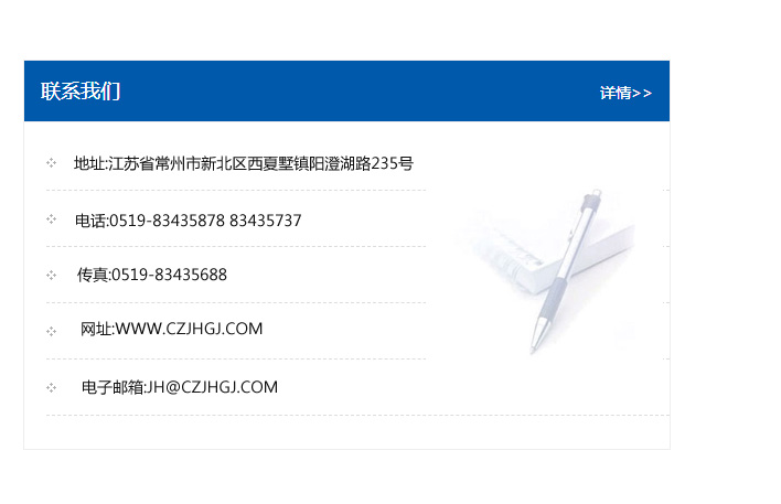 地址:常州市新北區友邦商務大廈1幢16、17層  電話:0519-85101652  傳真:0519-85112595  郵編:213022  網址:www_cz-jiayue_cn.huayabaihuo.com  郵箱:xiajifengaa@163.com